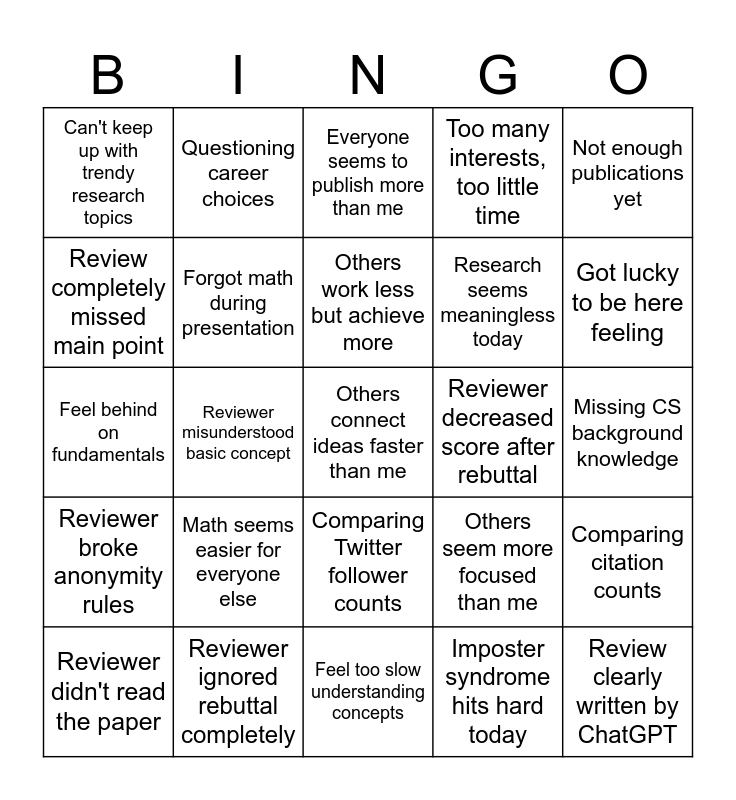 This bingo card has 30 words: Reviewer ignored rebuttal completely, Paper rejected with two-sentence review, Reviewer misunderstood basic concept, Feeling overwhelmed by coding tasks, Can't keep up with trendy research topics, Everyone seems to publish more than me, Forgot math during presentation, Comparing Twitter follower counts, Reviewer decreased score after rebuttal, Feel too slow understanding concepts, Missing CS background knowledge, Others connect ideas faster than me, Imposter syndrome hits hard today, Review clearly written by ChatGPT, Got lucky to be here feeling, First conference talk anxiety, Others seem more focused than me, Reviewer broke anonymity rules, Math seems easier for everyone else, Not enough publications yet, Feel behind on fundamentals, Others cite my wrong results, Questioning career choices, Research seems meaningless today, Review completely missed main point, Too many interests, too little time, Comparing citation counts, Reviewer didn't read the paper, Others work less but achieve more and Need to catch up with everything.