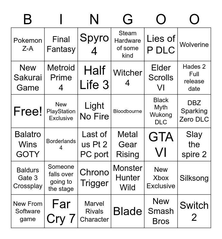 This bingo card has 36 words: Monster Hunter Wild, Chrono Trigger, Blade, New Sakurai Game, Balatro Wins GOTY, Bloodbourne, Metroid Prime 4, Marvel Rivals Character, Lies of P DLC, New Xbox Exclusive, Hades 2 Full release date, Steam Hardware of some kind, Silksong, New PlayStation Exclusive, Witcher 4, Pokemon Z-A, Baldurs Gate 3 Crossplay, Black Myth Wukong DLC, Free!, Spyro 4, Light No Fire, Borderlands 4, Metal Gear Rising, Last of us Pt 2 PC port, GTA VI, Final Fantasy, Elder Scrolls VI, Far Cry 7, Half Life 3, Wolverine, Switch 2, New From Software game, Slay the spire 2, DBZ Sparking Zero DLC, Someone falls over going to the stage and New Smash Bros.