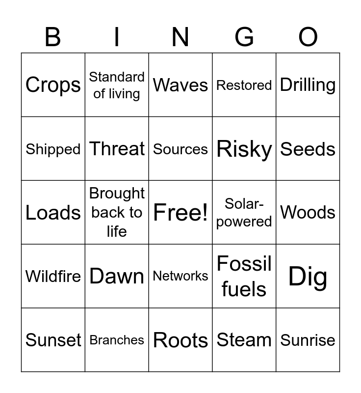 This bingo card has a free space and 36 words: Renewable energy, Global warming, Exposes, Threat, Fossil fuels, Wildfire, Sources, Raise money, Drilling, Landscape, Brought back to life, Restored, Oil spill, Solar-powered, Seeds, Crops, Cave, Dawn, Sunrise, Waves, Woods, Dig, Branches, Sunset, Roots, Standard of living, Loads, Time-consuming, Risky, Shipped, Risky, Lond-distance, Steam, Networks, Set up and high-speed.