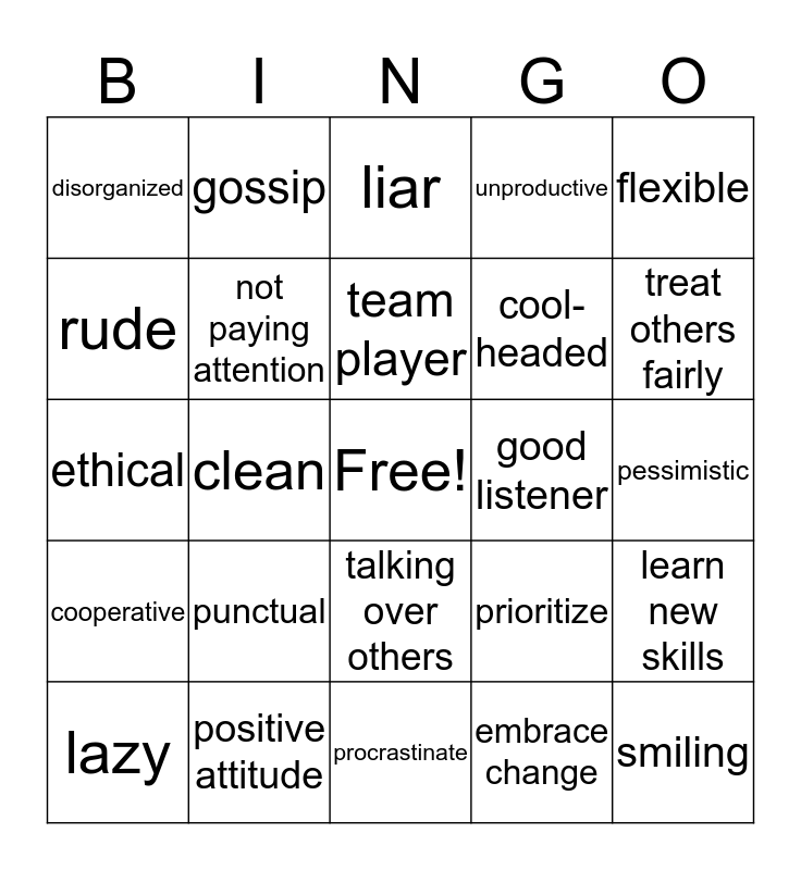 This bingo card has a free space and 24 words: punctual, positive attitude, team player, lazy, flexible, disorganized, rude, gossip, good listener, talking over others, cool-headed, ethical, prioritize, learn new skills, not paying attention, embrace change, pessimistic, liar, treat others fairly, clean, smiling, cooperative, unproductive and procrastinate.