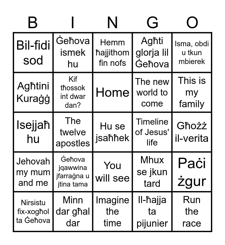 This bingo card has a free space and 24 words: Ġeħova jqawwina jfarraġna u jtina tama, Minn dar għal dar, Home, Nirsistu fix-xogħol ta Ġeħova, Isma, obdi u tkun mbierek, Bil-fidi sod, Agħtini Kuraġġ, Ġeħova ismek hu, Timeline of Jesus' life, You will see, The new world to come, Isejjaħ hu, Mhux se jkun tard, Paċi żgur, Kif tħossok int dwar dan?, Il-ħajja ta pijunier, Għożż il-verita, Hemm ħajjithom fin nofs, This is my family, The twelve apostles, Run the race, Jehovah my mum and me, Agħti glorja lil Ġeħova and Imagine the time.