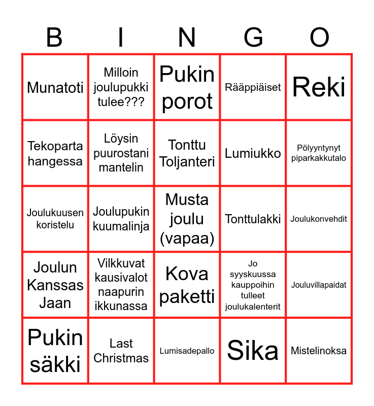 This bingo card has a free space and 60 words: Varpunen Jouluaamuna, Last Christmas, Heinillä Härkien Kaukalon, Joulun Kanssas Jaan, Sika, Kulkuset, Löysin puurostani mantelin, Sinappihuntu, Lumiukko, Joulukuvaelma, Rääppiäiset, Ähky, Tekoparta hangessa, Lumienkeli, Lahjapaperit, Munatoti, Mistelinoksa, Reki, Joulumuori, Tonttu Toljanteri, Tonttulakki, Pukin porot, Pukin säkki, Jouluvillapaidat, Adventtikalenteri, Kurkkivat tontut, Kauralyhde, Olkipukki Gävlessä paloi taas, Pölyyntynyt piparkakkutalo, Joulusiivous, Takkatuli (kanava), Santa Lucia, Kranssikisa rappukäytävässä, Jouluradio, Milloin joulupukki tulee???, Pienessä sievässä pikkujouluissa, Krampus vaanii, Joulupukin kuumalinja, Kynttelikkö ikkunalla, Joulukuusen koristelu, Problemaattiset tiernapojat, Vilkkuvat kausivalot naapurin ikkunassa, Joulukonvehdit, Tuskanhiki marketissa joulukuun 23. päivä, Jo syyskuussa kauppoihin tulleet joulukalenterit, Joulukalenterin muovilta maistuva suklaa, Glögissäni on roskia, Luumukeitto, Pehmeä paketti, Kova paketti, Lumisadepallo, Viime hetken lahjaostokset, Joululahjat hankittuna jo kesäkuussa, Joulukorttien viimeinen lähetyspäivä, Kuuluko rosolli joulupöytään?, Joululoma, Raketit marketeissa välipäivinä, Tinseli, Pipari and Vihreät kuulat.