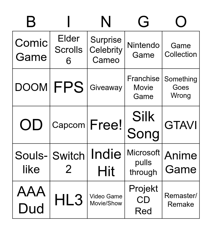 This bingo card has a free space and 24 words: Switch 2, HL3, Giveaway, AAA Dud, Game Collection, Comic Game, DOOM, Elder Scrolls 6, Silk Song, Indie Hit, Franchise Movie Game, OD, Microsoft pulls through, Anime Game, FPS, Projekt CD Red, GTAVI, Surprise Celebrity Cameo, Something Goes Wrong, Capcom, Remaster/ Remake, Souls-like, Nintendo Game and Video Game Movie/Show.