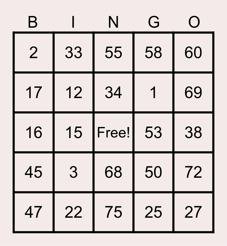 This bingo card has a free space and 24 words: 3, 22, 34, 47, 60, 2, 17, 33, 53, 68, 1, 16, 50, 72, 12, 25, 38, 55, 69, 15, 27, 45, 58 and 75.