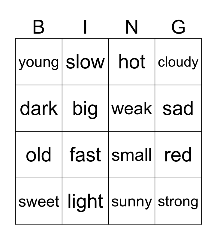 This bingo card has 20 words: red, cold, hot, sour, sweet, dark, light, young, old, slow, fast, small, big, strong, weak, happy, sad, cloudy, sunny and graceful.
