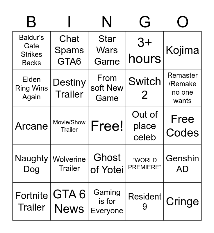 This bingo card has a free space and 24 words: Wolverine Trailer, GTA 6 News, From soft New Game, Fortnite Trailer, Kojima, Baldur's Gate Strikes Backs, Elden Ring Wins Again, Chat Spams GTA6, Out of place celeb, Ghost of Yotei, Switch 2, Arcane, "WORLD PREMIERE", Genshin AD, Destiny Trailer, Resident 9, Free Codes, Star Wars Game, Remaster /Remake no one wants, Movie/Show Trailer, Cringe, Naughty Dog, 3+ hours and Gaming is for Everyone.