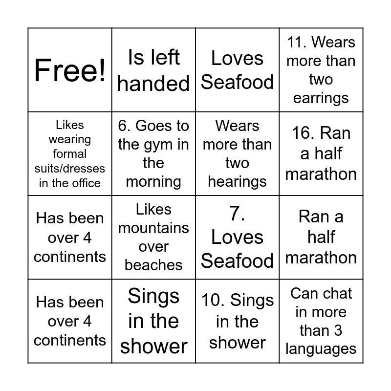 ⚠ This card has duplicate items: Likes mountains over beaches (2), Plays an instrument (2), Has been over 4 continents (2)