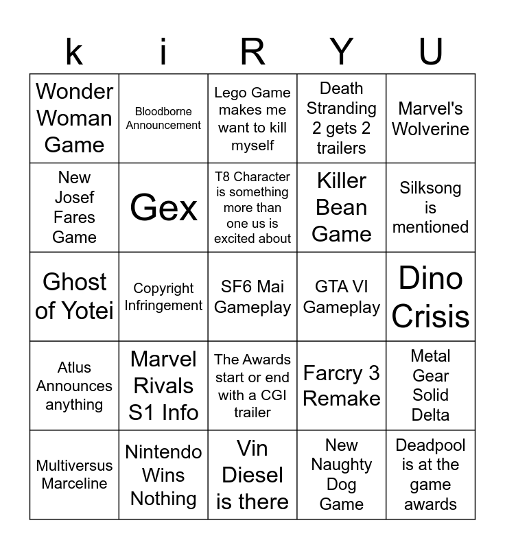 This bingo card has a free space and 24 words: Marvel Rivals S1 Info, Nintendo Wins Nothing, T8 Character is something more than one us is excited about, Multiversus Marceline, Marvel's Wolverine, Wonder Woman Game, New Josef Fares Game, Bloodborne Announcement, GTA VI Gameplay, The Awards start or end with a CGI trailer, Killer Bean Game, Ghost of Yotei, Farcry 3 Remake, Metal Gear Solid Delta, Gex, New Naughty Dog Game, Dino Crisis, Lego Game makes me want to kill myself, Silksong is mentioned, Copyright Infringement, Deadpool is at the game awards, Atlus Announces anything, Death Stranding 2 gets 2 trailers and Vin Diesel is there.