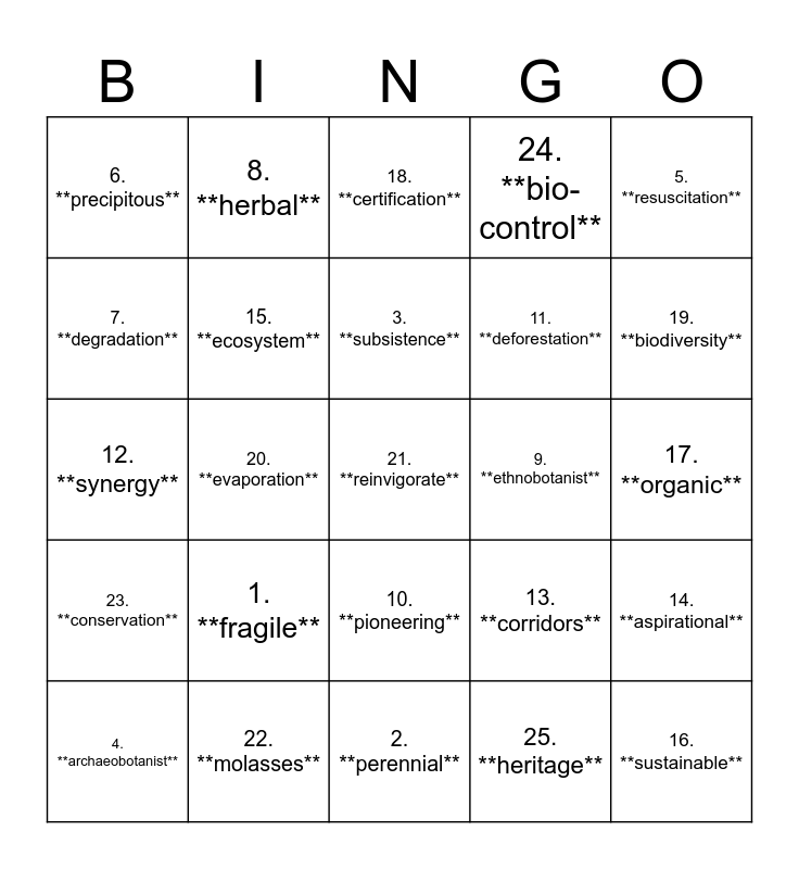 This bingo card has 25 words: 1. **fragile**, 2. **perennial**, 3. **subsistence**, 4. **archaeobotanist**, 5. **resuscitation**, 6. **precipitous**, 7. **degradation**, 8. **herbal**, 9. **ethnobotanist**, 10. **pioneering**, 11. **deforestation**, 12. **synergy**, 13. **corridors**, 14. **aspirational**, 15. **ecosystem**, 16. **sustainable**, 17. **organic**, 18. **certification**, 19. **biodiversity**, 20. **evaporation**, 21. **reinvigorate**, 22. **molasses**, 23. **conservation**, 24. **bio-control** and 25. **heritage**.