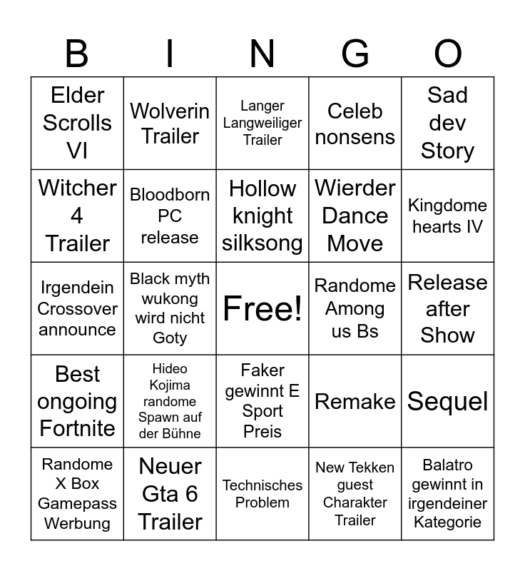 This bingo card has a free space and 24 words: Hideo Kojima randome Spawn auf der Bühne, Neuer Gta 6 Trailer, Hollow knight silksong, Randome X Box Gamepass Werbung, Sad dev Story, Elder Scrolls VI, Witcher 4 Trailer, Wolverin Trailer, Randome Among us Bs, Faker gewinnt E Sport Preis, Wierder Dance Move, Irgendein Crossover announce, Remake, Sequel, Bloodborn PC release, New Tekken guest Charakter Trailer, Release after Show, Langer Langweiliger Trailer, Kingdome hearts IV, Black myth wukong wird nicht Goty, Balatro gewinnt in irgendeiner Kategorie, Best ongoing Fortnite, Celeb nonsens and Technisches Problem.