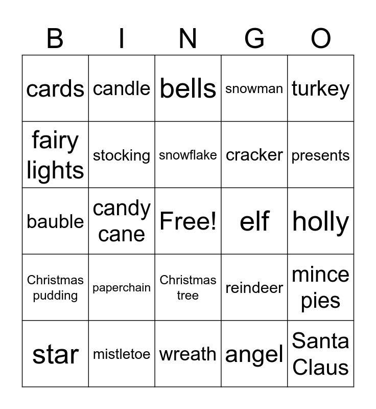 This bingo card has a free space and 24 words: paperchain, mistletoe, snowflake, star, turkey, cards, fairy lights, candle, elf, Christmas tree, cracker, bauble, reindeer, mince pies, stocking, angel, holly, bells, presents, candy cane, Santa Claus, Christmas pudding, snowman and wreath.
