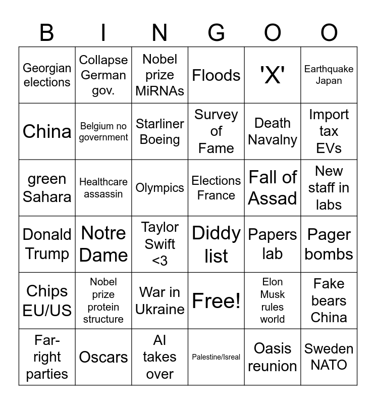 This bingo card has 36 words: Free!, War in Ukraine, Palestine/Isreal, China, Donald Trump, Elections France, Belgium no government, AI takes over, 'X', Elon Musk rules world, Import tax EVs, Floods, Fake bears China, Healthcare assassin, Survey of Fame, Georgian elections, Chips EU/US, Fall of Assad, green Sahara, Nobel prize MiRNAs, Olympics, Notre Dame, Diddy list, Taylor Swift <3, Papers lab, Collapse German gov., Death Navalny, Oscars, Starliner Boeing, Earthquake Japan, Sweden NATO, Far-right parties, Pager bombs, New staff in labs, Nobel prize protein structure and Oasis reunion.