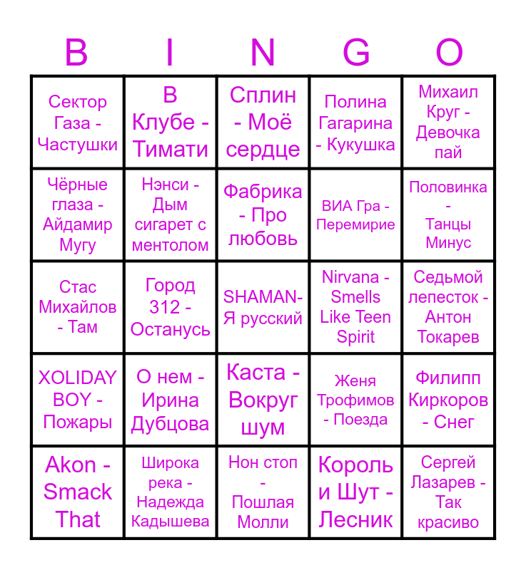 This bingo card has 35 words: Татьяна Куртукова - Матушка земля, Captain - Miyagi, Моя игра - БАСТА, Нэнси - Дым сигарет с ментолом, Каста - Вокруг шум, Полина Гагарина - Кукушка, Чёрные глаза - Айдамир Мугу, Фристайл - Ах, какая женщина, Фабрика - Про любовь, Руки Вверх - Студент, Стас Михайлов - Там, Михаил Круг - Девочка пай, Несчастный случай - Генералы песчаных карьеров, SLAVA SKRIPKA - Бобр, Сектор Газа - Частушки, Nirvana - Smells Like Teen Spirit, Король и Шут - Лесник, Город 312 - Останусь, XOLIDAY BOY - Пожары, SHAMAN- Я русский, Женя Трофимов - Поезда, Akon - Smack That, Филипп Киркоров - Снег, Широка река - Надежда Кадышева, Сплин - Моё сердце, Половинка - Танцы Минус, Сергей Лазарев - Так красиво, Возле дома твоего - Серёга, ВИА Гра - Перемирие, Седьмой лепесток - Антон Токарев, Сигма Бой Betsy feat Мария Янковская, Нон стоп - Пошлая Молли, О нем - Ирина Дубцова, В Клубе - Тимати and Лети! Беги! - Другие правила.