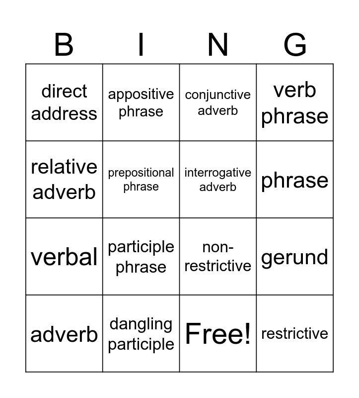 This bingo card has 17 words: Free!, adverb, conjunctive adverb, direct address, participle phrase, verb phrase, gerund, interrogative adverb, phrase, prepositional phrase, dangling participle, non-restrictive, relative adverb, appositive phrase, verbal, double negative and restrictive.