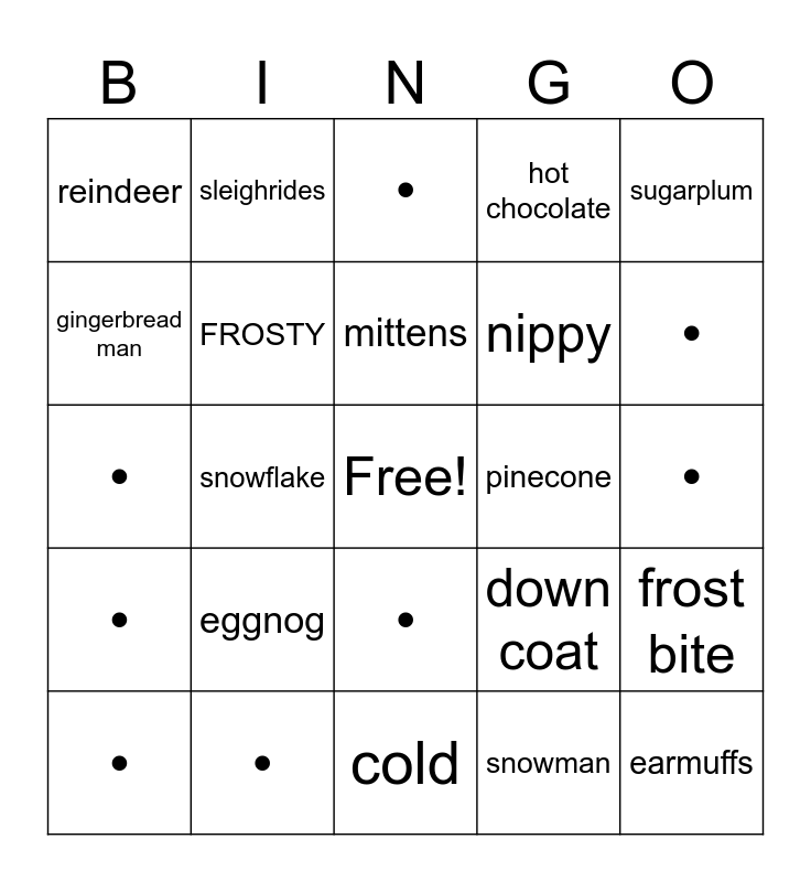 This bingo card has a free space and 49 words: December, earmuffs, Christmas, cold, eggnog, fireplace, sleighrides, fuzzy blankets, gingerbread man, frozen, FROSTY, hot chocolate, frost bite, down coat, ice storm, Jack Frost, mittens, pinecone, sweater, sugarplum, snowflake, snowman, reindeer, nippy, •, •, •, •, •, •, •, •, •, •, •, •, •, •, •, •, •, •, •, •, •, •, •, • and •.
