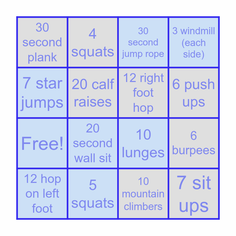 This bingo card has 20 words: 12 hop on left foot, 3 push ups, 30 second jump rope, 6 burpees, run 1 lap, 20 second wall sit, 10 mountain climbers, 3 windmill (each side), Free!, 4 squats, 10 lunges, 6 push ups, 30 second plank, 5 squats, 12 right foot hop, 9 jumping jacks, 7 star jumps, 20 calf raises, 8 leg lifts and 7 sit ups.