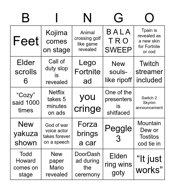 This bingo card has a free space and 24 words: God of war voice actor takes forever on a speech, New paper Mario revealed, Lego Fortnite ad, Todd Howard comes on stage, Tpain is revealed as a new skin for Fortnite or cod, Feet, Elder scrolls 6, Kojima comes on stage, One of the presenters is shitfaced, Forza brings a car, New souls-like ripoff, “Cozy” said 1000 times, Peggle 3, Mountain Dew or Tostitos cod tie in, Call of duty slop is revealed, Elden ring wins goty, Switch 2 Skyrim announcement, Animal crossing golf like game revealed, Twitch streamer included, Netflix takes 5 minutes on ads, “It just works”, New yakuza shown, B A L A T R O SWEEP and DoorDash ad during the ceremony.