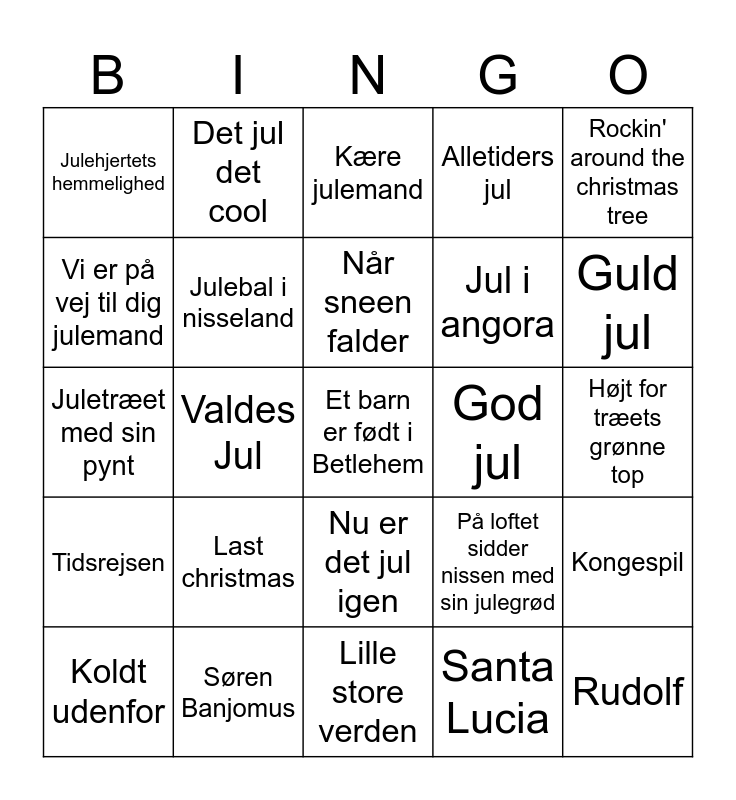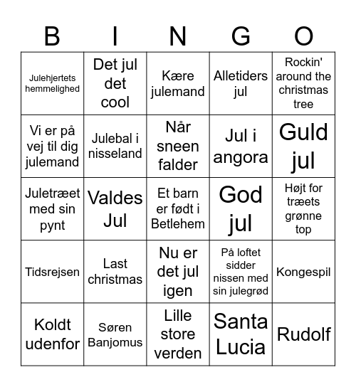 This bingo card has 30 words: Søren Banjomus, Julefeber, Valdes Jul, Tinka, Julehjertets hemmelighed, Kære julemand, Julebal i nisseland, Nu er det jul igen, God jul, Lille store verden, Højt for træets grønne top, Et barn er født i Betlehem, Santa Lucia, Rudolf, Guld jul, Jeg så julemanden kysse mor, På loftet sidder nissen med sin julegrød, Tidsrejsen, Last christmas, Rockin' around the christmas tree, Juletræet med sin pynt, Det er risengrød, Det jul det cool, Jul i angora, Vi er på vej til dig julemand, Alletiders jul, Kongespil, Koldt udenfor, Når sneen falder and Drømte mig en lille drøm.