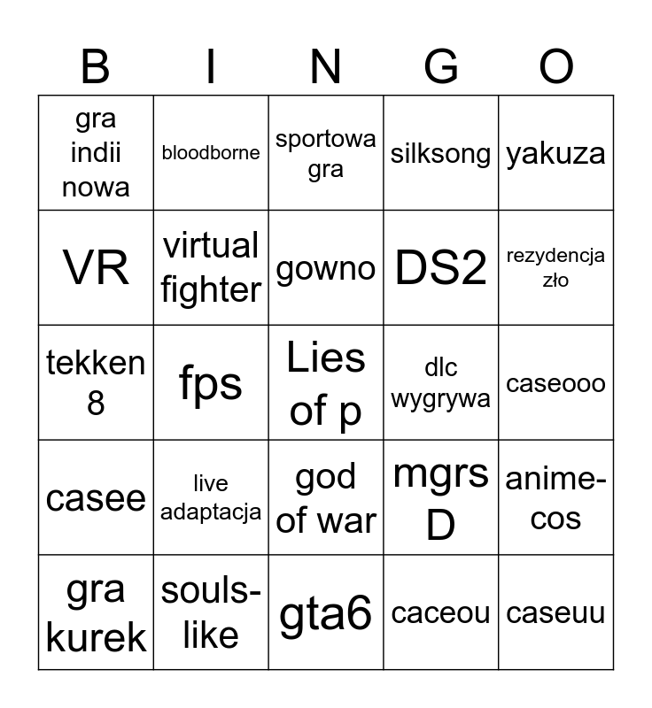 This bingo card has a free space and 24 words: live adaptacja, souls-like, gowno, gra kurek, yakuza, gra indii nowa, VR, bloodborne, dlc wygrywa, god of war, DS2, tekken 8, mgrs D, anime-cos, virtual fighter, caceou, caseooo, sportowa gra, rezydencja zło, fps, caseuu, casee, silksong and gta6.