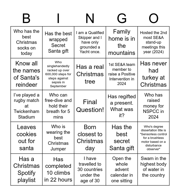 This bingo card has a free space and 24 words: Who is wearing the best Christmas Jumper, Has completed 10 climbs in 22 hours, Has a real Christmas tree, Has a Christmas Spotify playlist, Hosted the 2nd most SE&A stand-up meetings this year (2024), Who has the best Christmas socks on today, Know all the names of Santa's reindeer, Has the best wrapped Secret Santa gift, Has regifted a present. What was it?, Born closest to Christmas day, 1st SE&A team member to raise a Positive Intervention in 2024, I’ve played a rugby match at Twickenham Stadium, Has the best secret Santa gift, Who's degree dissertation title is "Sensorless control for a brushless motor based on a disturbance observer", Who singlehandedly racked up over 600,000 steps for steps against sepsis in September, Open the whole advent calendar in one sitting, Who has raised money for NSPCC in 2024, I am a Qualified Skipper and I have only grounded a Yacht once., Has never had turkey at Christmas, Who can free-dive and hold their breath for 5 mins, Swam in the highest body of water in the country, Leaves cookies out for santa, Family home is in the mountains and I have travelled to 30 countries under the age of 30.