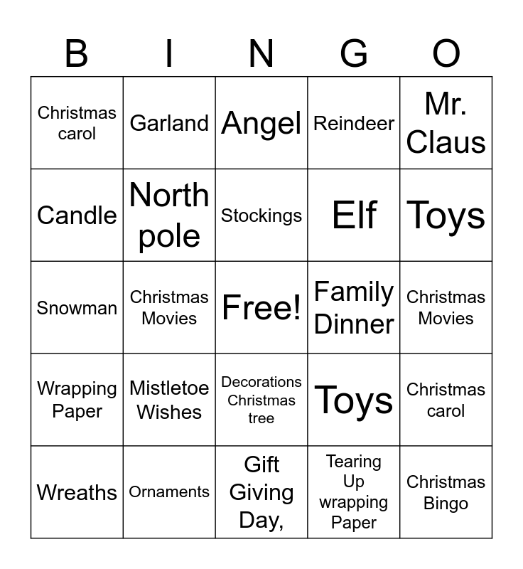 This bingo card has a free space and 54 words: Christmas Day, Wrapping Paper, Gifts, Christmas Snowfall, Decorations Christmas tree, gifts bells, Reindeer, Angel, Candle, Snowman, Christmas carol, Cookies, Ornaments, Wreaths, Wishes, Gift Giving Day,, Christmas Bingo, Elf, Stockings, Christmas Movies, Toys, Christmas Lights, Family Dinner, Mr. Claus, Mrs. Claus, Garland, Tinsel, Christmas Trees, Christmas Sleigh Bells, Tearing Up wrapping Paper, Christmas Star, Christmas tree, Bells, Reindeer, Angel, Candle, Snowman, Christmas carol, Cookies, North pole, Chimney, Sleigh, Christmas cards, Christmas eve, Mistletoe Wishes, Gift Giving Day,, Christmas Bingo, Elf, Stockings, Christmas Movies, Toys, Christmas Lights, Family Dinner and Mr. Claus.