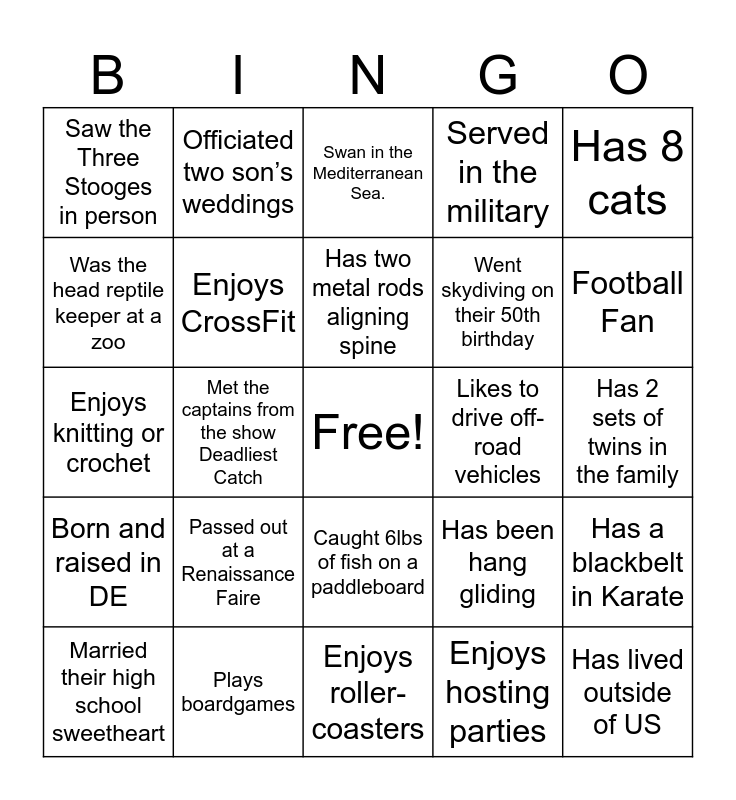 This bingo card has a free space and 64 words: Sang at someone’s wedding, Flew in the back of a F-15 fighter jet, Has a genetic foreshortening of one thumb, Has a blackbelt in Karate, Started a Soccer division, Does taxidermy for fun, Officiated two son’s weddings, Learned to fly and flew from Milford to Lewes and back, Has two metal rods aligning spine, Trained seals and sea lions at an aquarium, Caught 6lbs of fish on a paddleboard, Studies German Medieval Longsword, Has 2 sets of twins in the family, Has 8 cats, Acted in plays, Was the head reptile keeper at a zoo, Met the captains from the show Deadliest Catch, Saw the Three Stooges in person, Has never crossed the Pacific Ocean, Went skydiving on their 50th birthday, Passed out at a Renaissance Faire, Born and raised in DE, Served in the military, Can do a handstand, Has worked in retail, Rodes horses, Enjoys standup shows, Has an exotic pet, Has had stitches, Has a large book collection, A fan of country music, Has visited the Southern Hemisphere, Is part of a community org. ( Elks, Moose, VFW etc.), Can speak another language, Football Fan, Married their high school sweetheart, Is a fan of fantasy, Enjoys hosting parties, Wears contacts, Enjoys CrossFit, Enjoys knitting or crochet, Likes to drive off-road vehicles, Has visited a presidential home/site, Has more than 5 houseplants, Competed or judged in National History Day, Has lived outside of US, Plays boardgames, From outside the mid- Atlantic, Has been hang gliding, Is a movie buff, Has a child or children, Does martial arts, Enjoys roller-coasters, Volunteers regularly outside of HCA, Has moved less than 3 times, Lives in a historic house, Swan in the Mediterranean Sea., Plays in a band, Grew up in a large family, Has 3+ tattoos, Has gone backpacking, Has traveled to Alaska or Hawaii, Is left- handed and Can speak anther language.