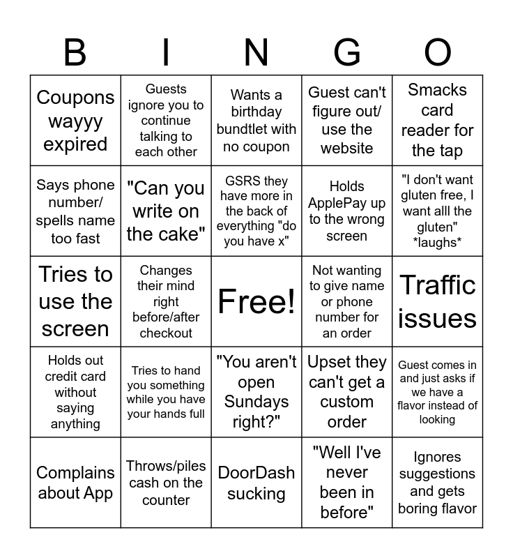This bingo card has a free space and 29 words: Complains about App, Gives the wrong name for a pickup, Changes their mind right before/after checkout, Can't put sidewalk sign out due to weather, Coupons wayyy expired, Wants a birthday bundtlet with no coupon, "Can you write on the cake", Tries to hand you something while you have your hands full, Not wanting to give name or phone number for an order, Throws/piles cash on the counter, Traffic issues, Ignores suggestions and gets boring flavor, DoorDash sucking, "Well I've never been in before", "I don't want gluten free, I want alll the gluten" *laughs*, Somehow we inconvience them with our hours, "You aren't open Sundays right?", Holds out credit card without saying anything, Smacks card reader for the tap, Tries to use the screen, Upset they can't get a custom order, Points to what they want instead of using words, Holds ApplePay up to the wrong screen, Says phone number/ spells name too fast, Guest can't figure out/ use the website, Guests ignore you to continue talking to each other, Guest comes in and just asks if we have a flavor instead of looking, GSRS they have more in the back of everything "do you have x" and guy who sits out front for hours.