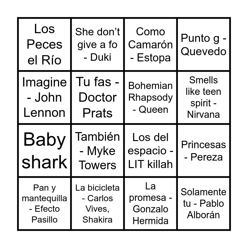 This bingo card has 75 words: La Marina esta morena - Figa Flawas, Himne del barça, Como Camarón - Estopa, Si antes te hubiera conocido - Karol G, Coti x Coti - The Tyets, Volcans - Buhos, Macarena - Los del Río, Limbo - Daddy Yankee, Clocks - Coldplay, Despacito - Luís Fonsi, Indios y vaqueros - Sinsinati i Álvaro de Luna, Sense tu - Teràpia de Shock, Smells like teen spirit - Nirvana, Tu fas - Doctor Prats, Elefants - Oques Grasses, Princesas - Pereza, Si por mi fuera - Beret, Pan y mantequilla - Efecto Pasillo, De l’1 al què - The Tyets, Imagine - John Lennon, Story of my life - One Direction, Los del espacio - LIT killah, Bohemian Rhapsody - Queen, She don’t give a fo - Duki, Punto g - Quevedo, I wanna dance with somebody - Whitney Houston, El mambo - Kiko Rivera, Let it be - The Beatles, Nochentera - Vicco, Gata only - FloyyMenor, Cris MJ, Hay lupita - Lomiiel, Eu quero tchu, eu quero tcha - João Lucas & Marcelo, Dancing queen - ABBA, Ohnana - Kapo, También - Myke Towers, Baby shark, Shape of you - Ed Sheeran, Hallelujah - Leonard Cohen, La promesa - Gonzalo Hermida, Material girl - Madonna, Lala - Myke Towers, Paquito el Chocolatero - Alan Duffy, Skyfall - Adele, Set fire to the rain - Adele, Rolling in the deep - Adele, When we were young - Adele, Con Mi Burrito Sabanero, Los Peces el Río, Jingle bell Rock - Bobby Helms, Vuela vuela, A esa - Pimpinela, Ave maría - Jarkko Ahola, Vivir mi vida - Marc Anthony, Física o química, A dios le pido - Juanes, Sin miedo a nada - Álex Ubago, Sembla mentida - Mushkaa, Rosas - La Oreja de Van Gogh, Polaris - Feid, Quevedo, Saiko, Mercho - LiL CaKe, Ozuna, Rayan Castro, Coco Loco - Maluma, Danza kuduro - Don Omar, Soltera - Shakira, Waka waka - Shakira, Devuélveme a mi chica - Hombres G, La bicicleta - Carlos Vives, Shakira, All I want for christmas Is you - Justin Biber, Maria Carey, Me voy - Julieta Venegas, Ni una sola palabra - Pablo Alborán, La nave del olvido - José José, Solamente tu - Pablo Alborán, Yo quiero bailar - Sonia i Selena, Mi gran noche - Raphael, Uwaie - Kapo and BOMBÓN - Karina, Hugo23, Sennior.