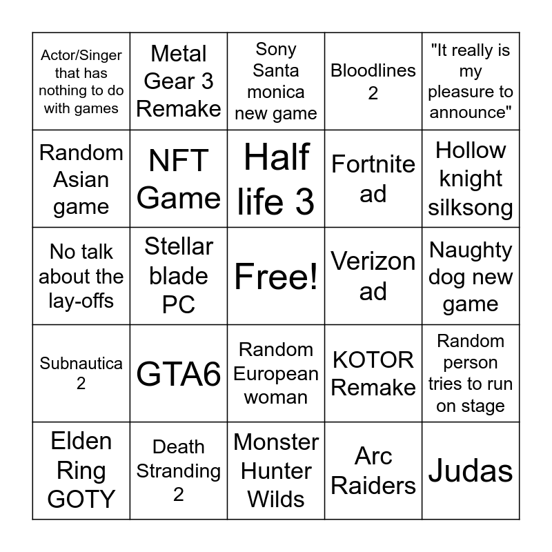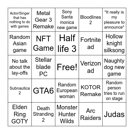 This bingo card has a free space and 24 words: GTA6, Death Stranding 2, Half life 3, Elden Ring GOTY, "It really is my pleasure to announce", Actor/Singer that has nothing to do with games, Random Asian game, Metal Gear 3 Remake, Verizon ad, Random European woman, Fortnite ad, No talk about the lay-offs, KOTOR Remake, Random person tries to run on stage, NFT Game, Arc Raiders, Naughty dog new game, Sony Santa monica new game, Hollow knight silksong, Stellar blade PC, Judas, Subnautica 2, Bloodlines 2 and Monster Hunter Wilds.