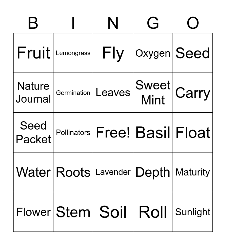 This bingo card has a free space and 24 words: Roots, Stem, Leaves, Flower, Seed, Fruit, Nature Journal, Lemongrass, Basil, Lavender, Sweet Mint, Seed Packet, Depth, Maturity, Germination, Roll, Float, Fly, Carry, Pollinators, Sunlight, Water, Oxygen and Soil.