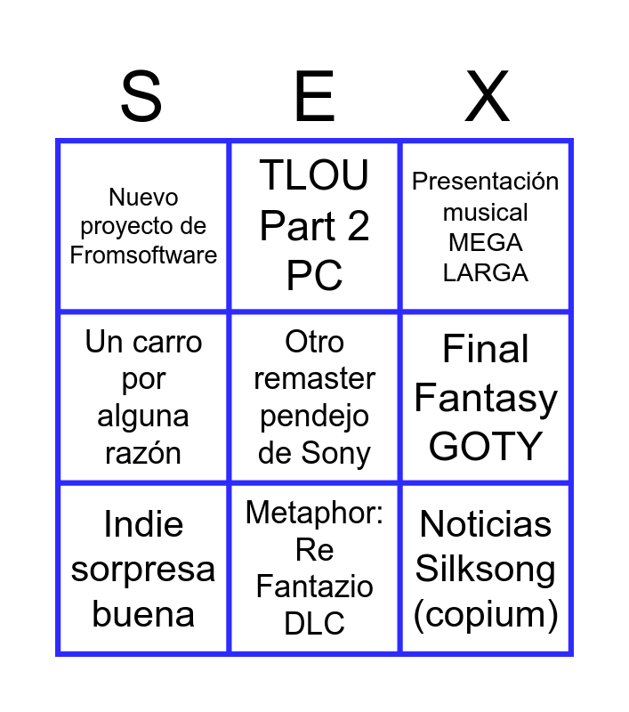This bingo card has a free space and 24 words: DS3 Remaster, Bloodborne PC/Remaster, Metaphor: Re Fantazio DLC, Stellar Blade PC, Noticias Silksong (copium), Nuevo proyecto de Fromsoftware, Final Fantasy GOTY, TLOU Part 2 PC, Sponsor no gamer, Celebridad Random, "My friend Kojima-San", Metaverso, "quiero competir con Fortnite", Trailer cinematico "humo", Indie sorpresa buena, Premio fuera de cámara, Populismo, Presentación musical MEGA LARGA, GTA V otra vez, Algo NFT, Chris Pratt, Fortnite, Un carro por alguna razón and Segmento X dura demasiado.