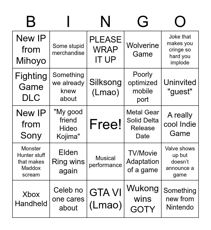 This bingo card has a free space and 24 words: Elden Ring wins again, Celeb no one cares about, Silksong (Lmao), Xbox Handheld, Joke that makes you cringe so hard you implode, New IP from Mihoyo, Fighting Game DLC, Some stupid merchandise, Metal Gear Solid Delta Release Date, Musical performance, Poorly optimized mobile port, New IP from Sony, TV/Movie Adaptation of a game, Valve shows up but doesn’t announce a game, Something we already knew about, Wukong wins GOTY, A really cool Indie Game, PLEASE WRAP IT UP, Uninvited "guest", "My good friend Hideo Kojima", Something new from Nintendo, Monster Hunter stuff that makes Maddox scream, Wolverine Game and GTA VI (Lmao).