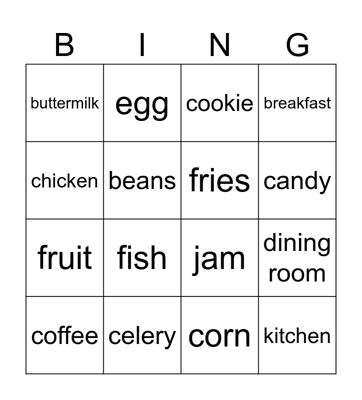 This bingo card has 36 words: grape, apple, banana, fries, blackberry, kitchen, candy, cherry, chicken, dessert, dining room, breakfast, carrot, celery, fish, buttermilk, cake, chocolate, coffee, cookie, corn, cucumber, chocolate, ice cream, dinner, egg, jam, ham, fruit, beans, blueberry, cheese, bread, butter, juice and appetizer.
