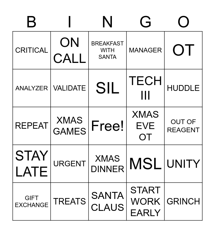 This bingo card has a free space and 34 words: STAT, START WORK EARLY, VACATION DENIED, CALIBRATE, STAY LATE, VALIDATE, OT, GIFT EXCHANGE, ON CALL, FAMILY LEAVE, SIL, BREAKFAST WITH SANTA, QC FAIL, VACATION DAY, XMAS EVE OT, HUDDLE, TREATS, REPEAT, URGENT, MSL, XMAS DINNER, EMAIL OVERLOAD, CRITICAL, OUT OF REAGENT, SANTA CLAUS, GRINCH, MANAGER, TECH II, TECH III, ANALYZER, TREATS, XMAS GAMES, UNITY and CHRISTMAS.