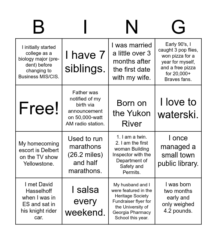 This bingo card has 16 words: I salsa every weekend., I once managed a small town public library., I was married a little over 3 months after the first date with my wife., I initially started college as a biology major (pre-dent) before changing to Business MIS/CIS., My homecoming escort is Delbert on the TV show Yellowstone., I have 7 siblings., 1. I am a twin. 2. I am the first woman Building Inspector with the Department of Safety and Permits., My husband and I were featured in the Heritage Society Fundraiser flyer for the University of Georgia Pharmacy School this year., Free!, Father was notified of my birth via announcement on 50,000-watt AM radio station., I met David Hasselhoff when I was in ES and sat in his knight rider car., Early 90's, I caught 3 pop flies, won pizza for a year for myself, and a free pizza for 20,000+ Braves fans., Used to run marathons (26.2 miles) and half marathons., I love to waterski., Born on the Yukon River and I was born two months early and only weighed 4.2 pounds..