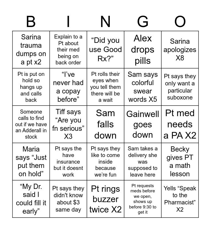 This bingo card has 56 words: “Just refill everything you can”, “My Dr. said I could fill it early”, “Can you call my Dr.?”, Sarina trauma dumps on a pt x2, Pt rings buzzer twice X2, Pt holds in buzzer X2, “I’ve never had a copay before”, Inventory doesn’t get ordered X2, Sam says colorful swear words X5, Maria can’t say words X3, Alex drops pills, Alex says “IDFK” X3, SG calls for delivery x4 same day, Tiff calls someone an idiot X2, Pt loses meds, Dr. sends in the same script wrong twice in a row, Sarina apologizes X8, Tiff says “Are you fn serious” X3, Alex says “I just work here”, Sam falls down, Gainwell goes down, Pt says they need a med but only give the color of the pill, Sam takes a delivery she was supposed to leave here, “Did you use Good Rx?”, Wants control at 9:00am X2, Pt rolls their eyes when you tell them there will be a wait, Gives insurance card after you ring up all their meds, Asks about a second person after you rang them up, Pt says they only want a particular suboxone, Pt wants to speak to the pharmacist x2, Pt argues about having refills, Pt says “It’s probably not ready” but they’re here anyway, “I seen my Dr send it”, “My Dr. said they sent it”, Pt med needs a PA X2, Pt is put on hold so hangs up and calls back, Someone calls to find out if we have an Adderall in stock, Pt rings buzzer when they can see you, Maria says “Just put them on hold”, Explain to a Pt about their med being on back order, Pt says they like to come inside because we’re fun, Yells “Speak to the Pharmacist” X2, Bubblepack wants done but isnt due x2, Calls for bubblepack that was TX to Embrace X3, Pt wants control at least 2 days early X2, Pt says the have insurance but it doesnt work, Pt says they didn't know about $3 same day, Something gets ordered we don’t need, Dr sends script that makes NO sense, Dr doesn’t send DX code, Pt requests meds before we open, shows up before 9:30 to get it, Tiff gets a vet question, All 5 phone lines on hold, Dr. calls & said they sent a script but we don’t have it, Becky gives PT a math lesson and Sam doesn't take a delivery she was supposed to.