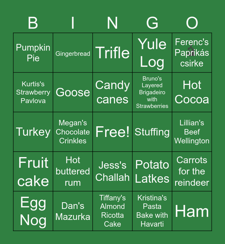 This bingo card has 1 images, a free space and 26 words: Jess's Challah, Kristina's Pasta Bake with Havarti, Candy canes, Dan's Mazurka, Ferenc's Paprikás csirke, Pumpkin Pie, Kurtis's Strawberry Pavlova, Gingerbread, Lillian's Beef Wellington, Potato Latkes, Bruno's Layered Brigadeiro with Strawberries, Turkey, Carrots for the reindeer, Egg Nog, Megan's Chocolate Crinkles, Christmas Pudding, Yule Log, Fruit cake, Trifle, Ham, Hot Cocoa, Tiffany's Almond Ricotta Cake, Stuffing, Hot buttered rum, Goose and Peppermint Bark.