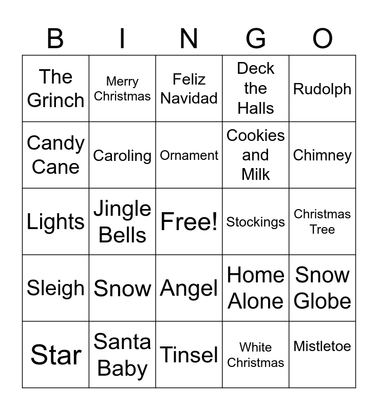 This bingo card has a free space and 39 words: Santa Claus, Reindeer, Eggnog, Caroling, Star, Angel, Ornament, Frosty the Snowman, Rudolph, Sleigh, Jingle Bells, Deck the Halls, Mistletoe, Christmas Tree, Stockings, Snow, Snowflake, The Grinch, Buddy the Elf, Home Alone, Candy Cane, Tinsel, Cookies and Milk, Chimney, Chestnuts, Jack Frost, Nativity, Scrooge, Jolly, Merry Christmas, Noel, Baby it's cold outside, Feliz Navidad, Santa Baby, White Christmas, Wreath, Snow Globe, Lights and Snowflake.