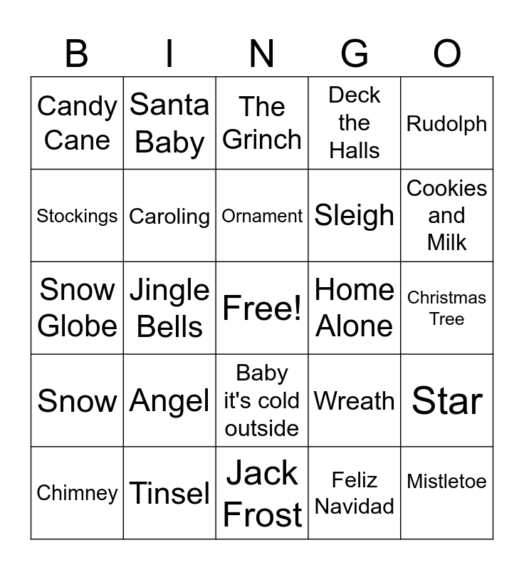 This bingo card has a free space and 38 words: Santa Claus, Reindeer, Eggnog, Caroling, Star, Angel, Ornament, Frosty the Snowman, Rudolph, Sleigh, Jingle Bells, Deck the Halls, Mistletoe, Christmas Tree, Stockings, Snow, Snowflake, The Grinch, Buddy the Elf, Home Alone, Candy Cane, Tinsel, Cookies and Milk, Chimney, Chestnuts, Jack Frost, Nativity, Scrooge, Jolly, Merry Christmas, Noel, Baby it's cold outside, Feliz Navidad, Santa Baby, White Christmas, Wreath, Snow Globe and Lights.