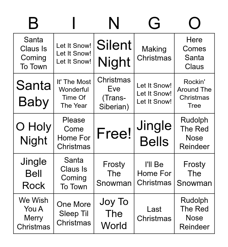⚠ This card has duplicate items: All I Want For Christmas (2), One More Sleep Til Christmas (2), Rockin' Around The Christmas Tree (2), Jingle Bell Rock (2), Last Christmas (2), Winter Wonderland (2), It' The Most Wonderful Time Of The Year (2), Holly Jolly Christmas (2), Let It Snow! Let It Snow! Let It Snow! (2), Feliz Navidad (2), Making Christmas (2), Please Come Home For Christmas (2), Santa Baby (2), O Holy Night (2), White Christmas (2), Santa Claus Is Coming To Town (2), Rudolph The Red Nose Reindeer (2), Here Comes Santa Claus (2), I'll Be Home For Christmas (2), Christmas Eve (Trans-Siberian) (2), Jingle Bells (2), Silent Night (2), We Wish You A Merry Christmas (2), Frosty The Snowman (2), Joy To The World (2), You're A Mean One (2)