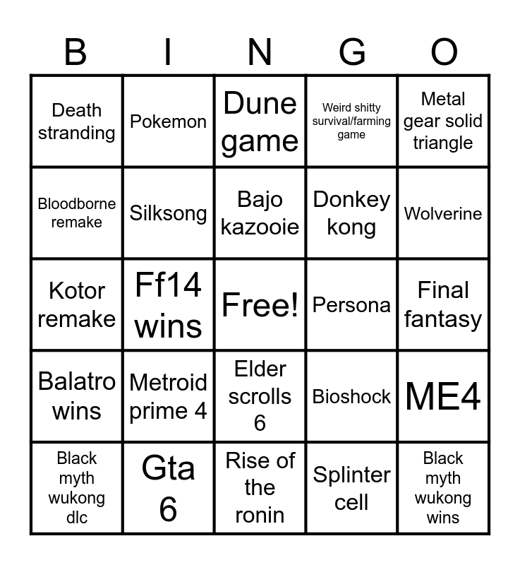 This bingo card has a free space and 24 words: Metroid prime 4, Gta 6, Bajo kazooie, Black myth wukong dlc, Metal gear solid triangle, Death stranding, Bloodborne remake, Pokemon, Persona, Elder scrolls 6, Donkey kong, Kotor remake, Bioshock, ME4, Silksong, Splinter cell, Final fantasy, Dune game, Wolverine, Ff14 wins, Black myth wukong wins, Balatro wins, Weird shitty survival/farming game and Rise of the ronin.