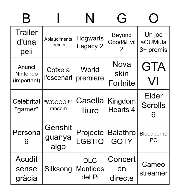 This bingo card has a free space and 24 words: Genshit guanya algo, Silksong, World premiere, Acudit sense gràcia, Un joc aCUMula 3+ premis, Trailer d'una peli, Anunci Nintendo (important), Aplaudiments forçats, Kingdom Hearts 4, Projecte LGBTIQ, Nova skin Fortnite, Celebritat "gamer", Balathro GOTY, Bloodborne PC, Cotxe a l'escenari, Concert en directe, Elder Scrolls 6, Hogwarts Legacy 2, GTA VI, "WOOOO!!!" random, Cameo streamer, Persona 6, Beyond Good&Evil 2 and DLC Mentides del Pi.