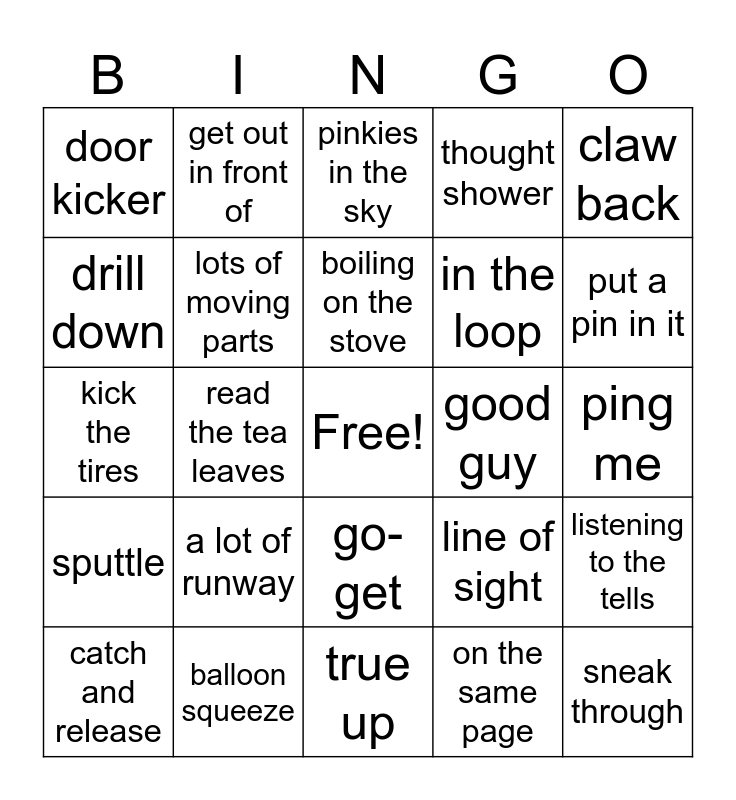 This bingo card has a free space and 24 words: a lot of runway, balloon squeeze, boiling on the stove, catch and release, claw back, door kicker, drill down, get out in front of, good guy, go-get, in the loop, kick the tires, line of sight, listening to the tells, lots of moving parts, on the same page, ping me, pinkies in the sky, put a pin in it, read the tea leaves, sneak through, sputtle, thought shower and true up.