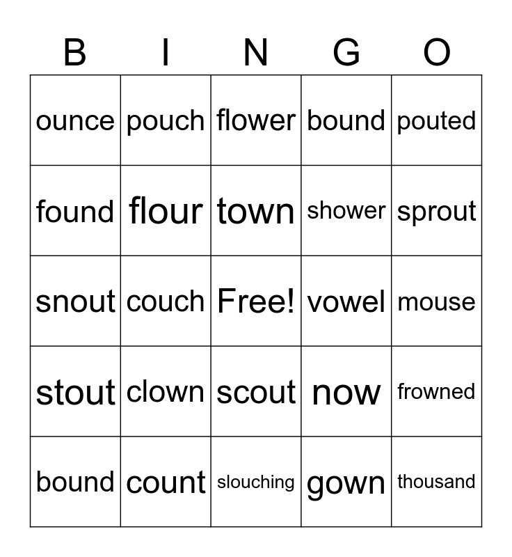 This bingo card has a free space and 30 words: count, brown, couch, house, ounce, flower, flour, scout, vowel, slouching, mouse, thousand, gown, chow, sprout, mound, now, stout, clown, pouted, snout, wow, pouch, shower, found, bound, frowned, bound, town and south.