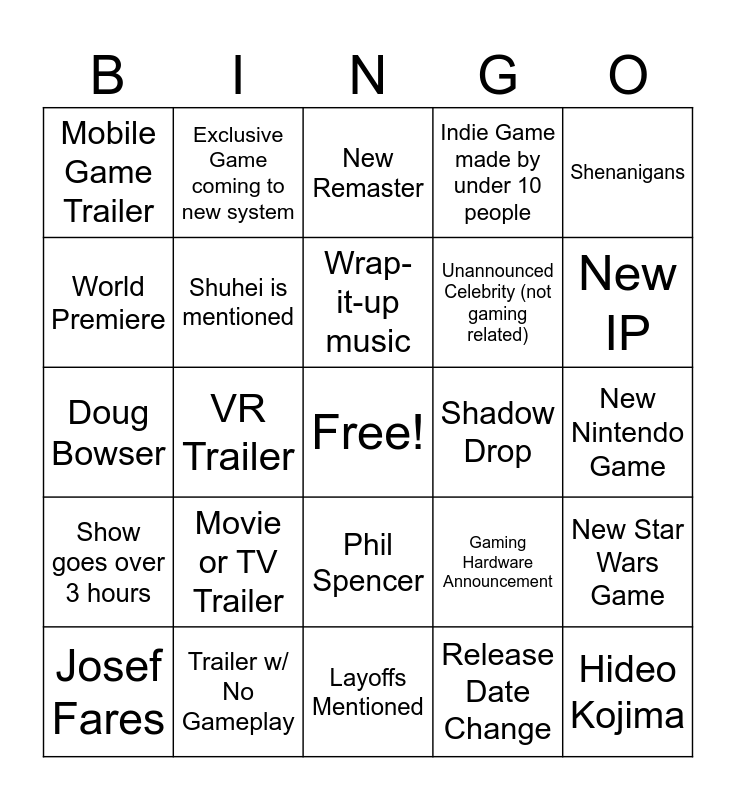 This bingo card has a free space and 24 words: Movie or TV Trailer, Trailer w/ No Gameplay, Wrap-it-up music, Josef Fares, Shenanigans, Mobile Game Trailer, World Premiere, Exclusive Game coming to new system, Shadow Drop, Phil Spencer, Unannounced Celebrity (not gaming related), Doug Bowser, Gaming Hardware Announcement, New Star Wars Game, Shuhei is mentioned, Release Date Change, New Nintendo Game, New Remaster, New IP, VR Trailer, Hideo Kojima, Show goes over 3 hours, Indie Game made by under 10 people and Layoffs Mentioned.