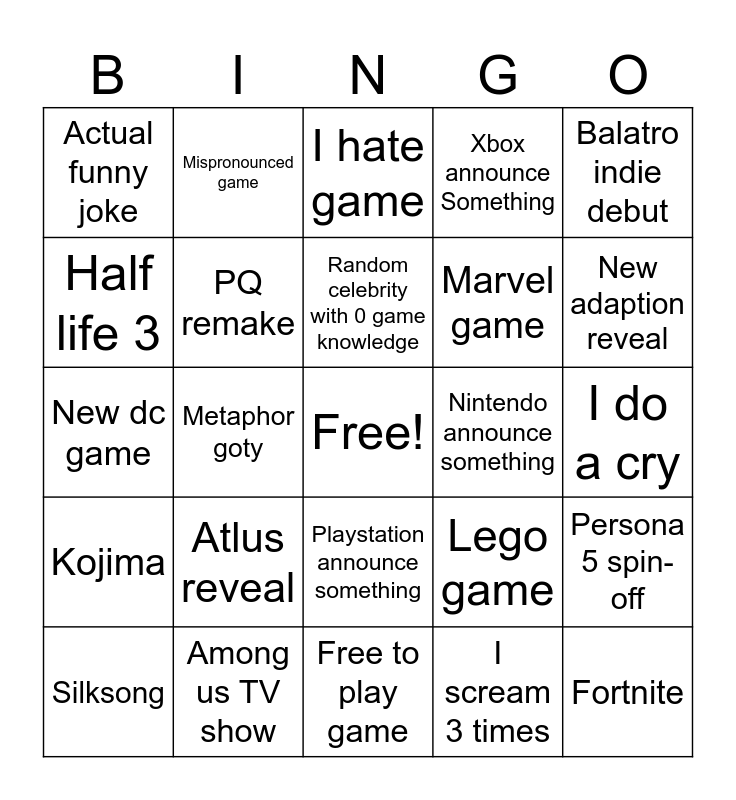 This bingo card has a free space and 24 words: Atlus reveal, Among us TV show, Random celebrity with 0 game knowledge, Silksong, Balatro indie debut, Actual funny joke, Half life 3, Mispronounced game, Nintendo announce something, Playstation announce something, Marvel game, New dc game, Lego game, Persona 5 spin-off, PQ remake, I scream 3 times, I do a cry, I hate game, New adaption reveal, Metaphor goty, Fortnite, Kojima, Xbox announce Something and Free to play game.