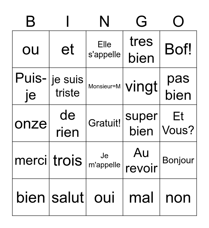 This bingo card has a free space and 24 words: trois, salut, Monsieur=M, bien, Bof!, ou, Puis-je, et, super bien, Je m'appelle, vingt, onze, Au revoir, Bonjour, je suis triste, mal, Et Vous?, Elle s'appelle, pas bien, de rien, non, merci, tres bien and oui.
