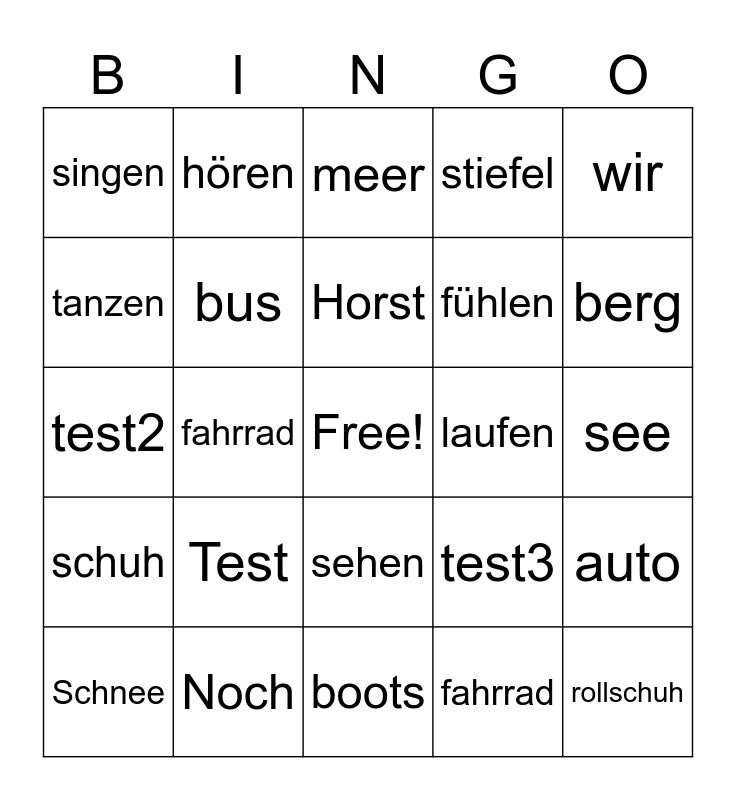 This bingo card has a free space and 24 words: Test, Noch, Horst, Schnee, wir, singen, tanzen, hören, laufen, sehen, fühlen, test2, test3, auto, bus, fahrrad, see, meer, berg, fahrrad, rollschuh, schuh, stiefel and boots.