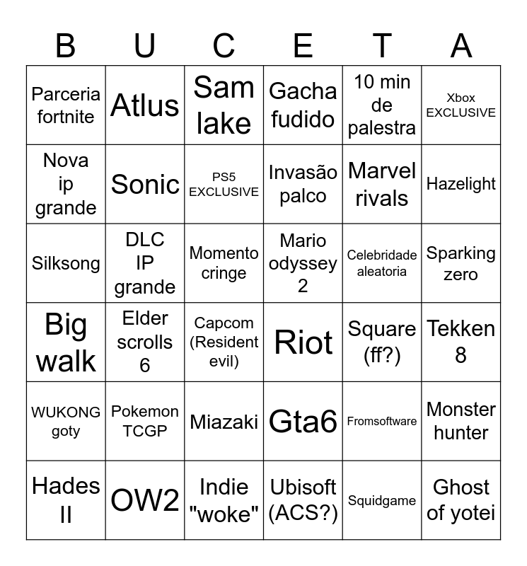 This bingo card has 36 words: Gta6, Miazaki, Ubisoft (ACS?), Nova ip grande, Big walk, Mario odyssey 2, Sonic, Indie "woke", 10 min de palestra, Fromsoftware, Hazelight, Gacha fudido, Monster hunter, DLC IP grande, Invasão palco, Parceria fortnite, WUKONG goty, Celebridade aleatoria, Silksong, Sam lake, Momento cringe, Elder scrolls 6, Riot, Capcom (Resident evil), Square (ff?), Atlus, Marvel rivals, OW2, PS5 EXCLUSIVE, Xbox EXCLUSIVE, Ghost of yotei, Hades II, Tekken 8, Sparking zero, Pokemon TCGP and Squidgame.