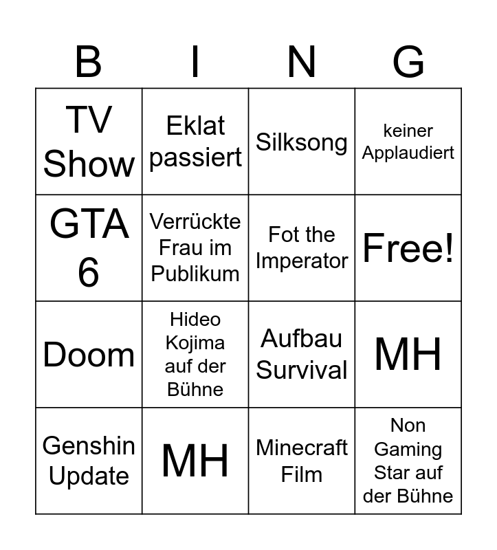 This bingo card has 18 words: Hideo Kojima auf der Bühne, Non Gaming Star auf der Bühne, Silksong, TV Show, Aufbau Survival, keiner Applaudiert, Genshin Update, Eklat passiert, Free!, Doom, Minecraft Film, GTA 6, MH, Verrückte Frau im Publikum, Fot the Imperator, Shadowdrop, MH and Shadowdrop.